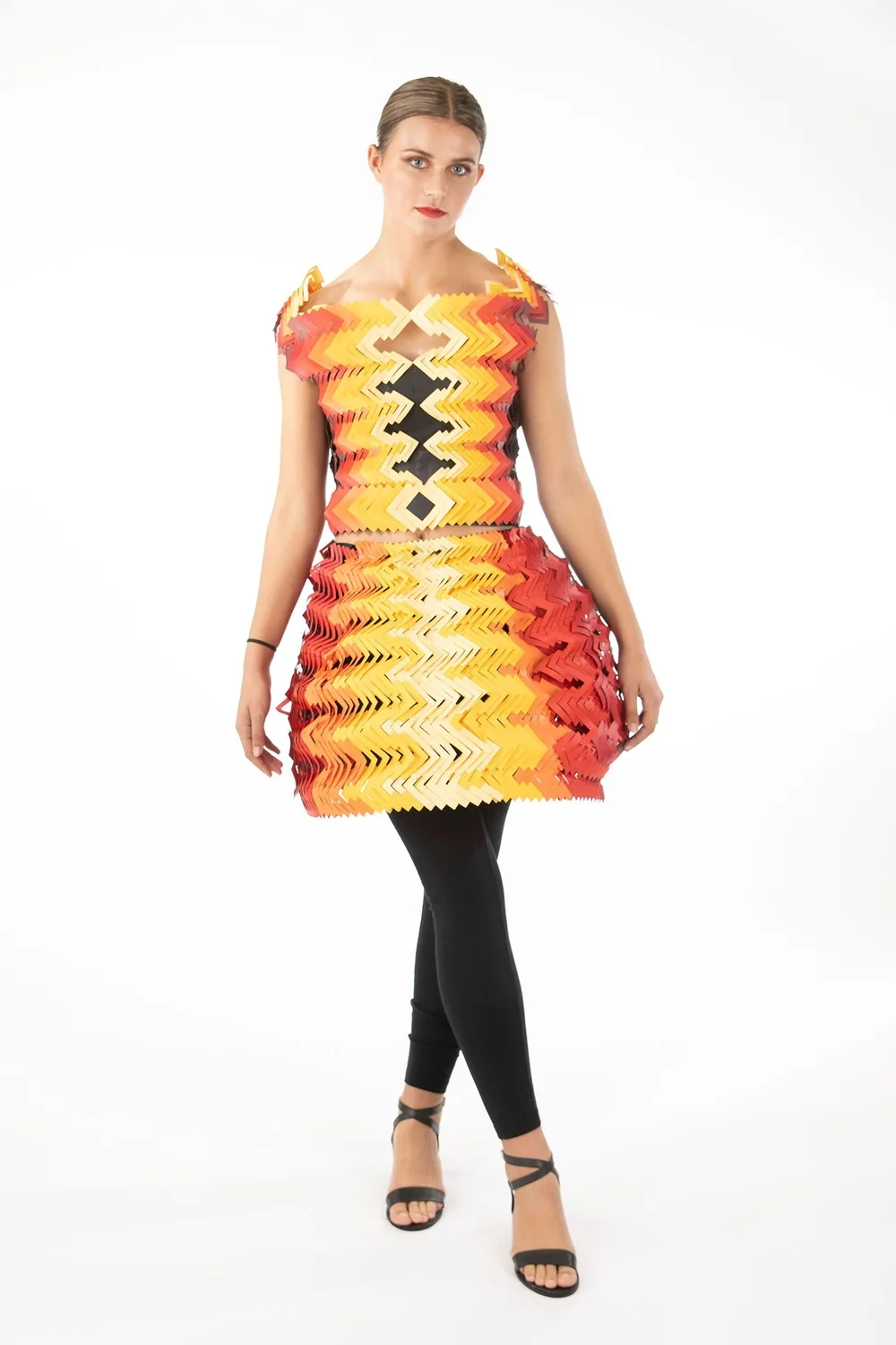 ‘Fire in My Soul’ is inspired by the fire that burns within each one of us fuelling our passions and desires. Individual pieces are ‘knit’ together without any visible seams and form an airy, fluid sculpture that forms to the body. Fire in My Soul uses texture and pattern to capture the energy that starts deep in our core and radiates throughout our body.’