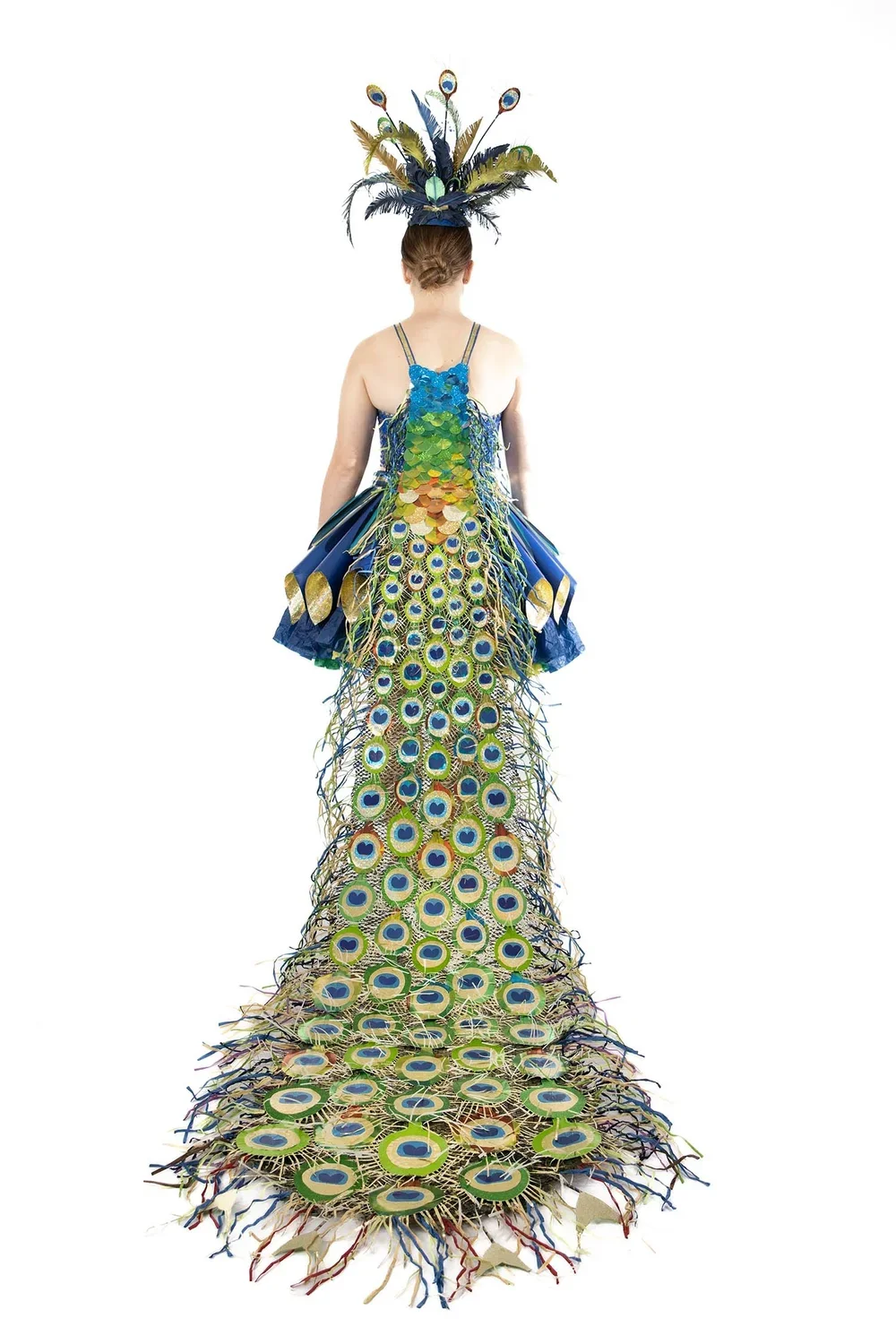 The dress is a reimagining the famous peacock dress of the 1900's as an homage to a bygone era of flamboyant luxury and excess. Likita is exploring how the physical material affects the shaping of functionality and form and the relationships that develop around their conception and use in an age of transformation and societal crisis.