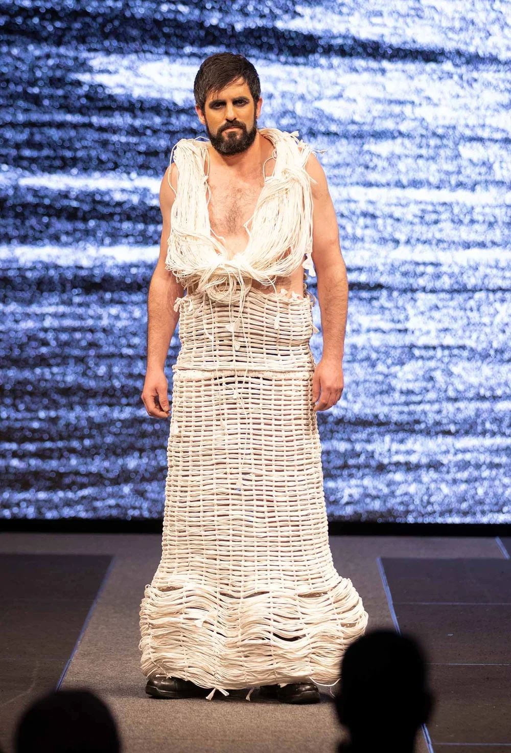Wrapped is a coiled basket gown that utilises a recycled, sustainable paper product. Barbara has made a wearable paper basket.