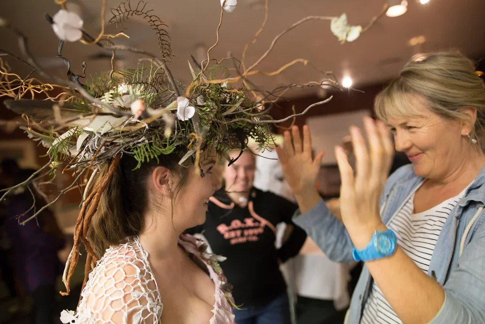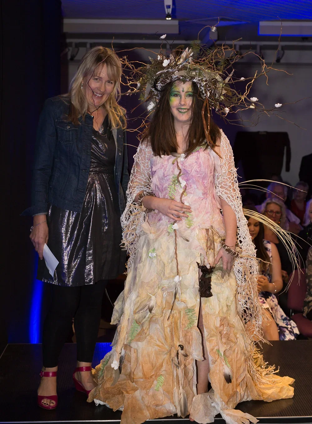 Materials used: Tissue paper, handmade paper from egg cartons, newspaper and recycled waste paper, reflex paper and hand-spun paper string. Natural found items from the beach and bush. The woven garland headdress is decorated with handmade paper and Tasmanian flowers and twigs.