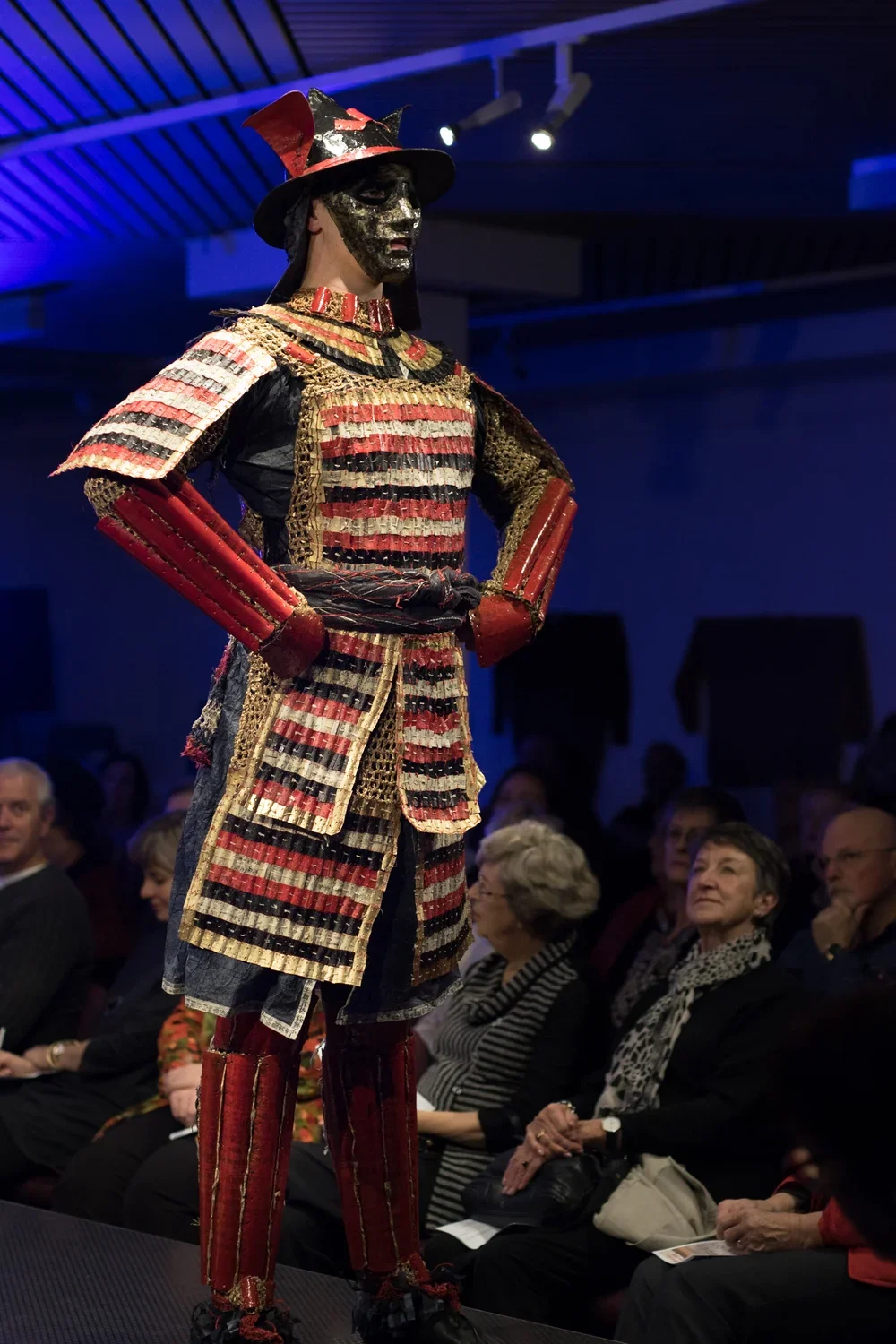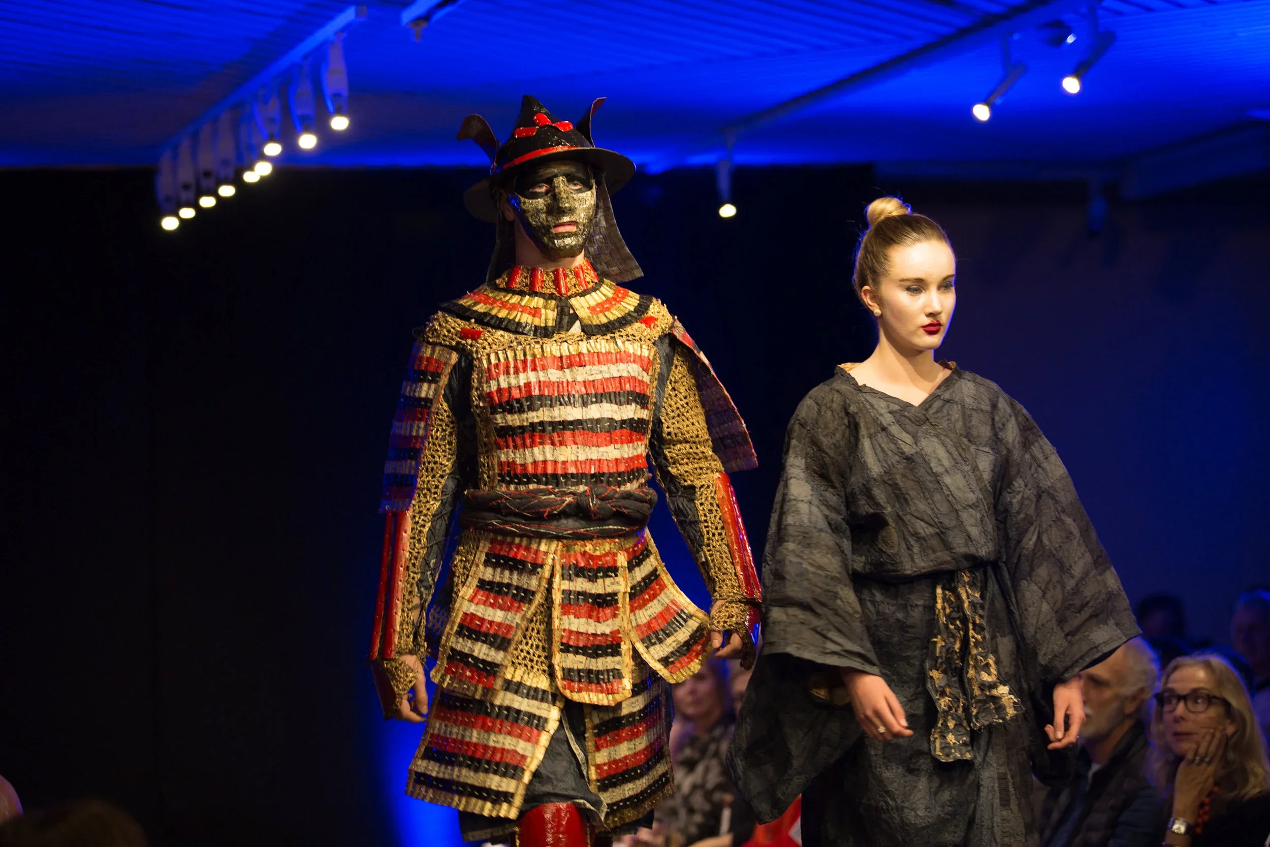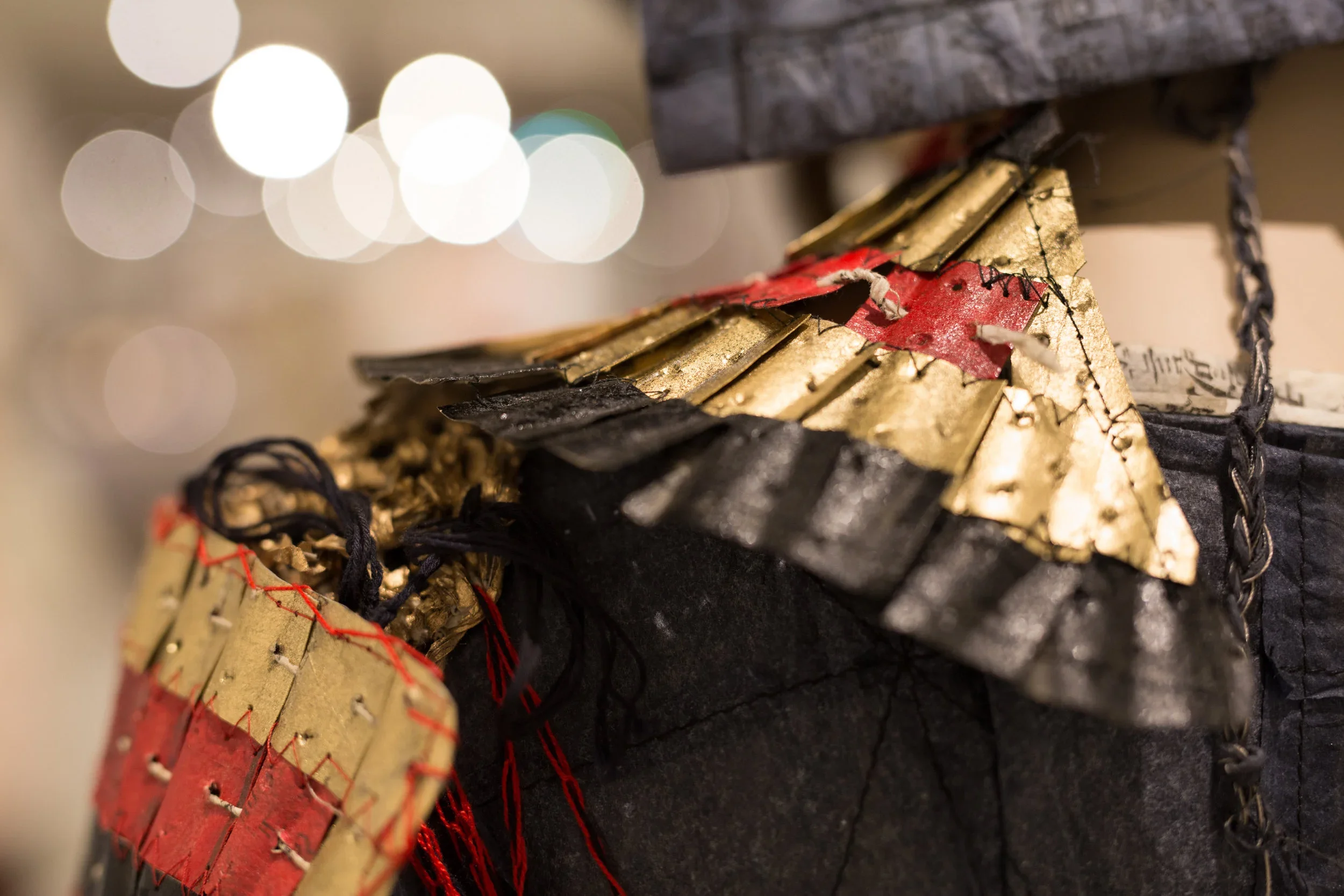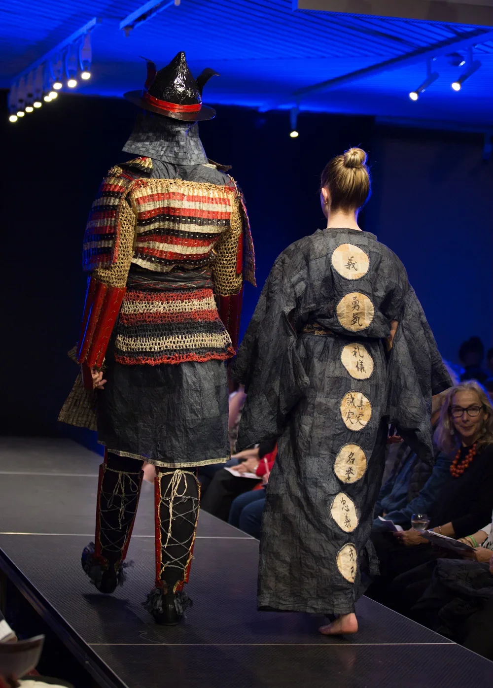 Samurai tradition was underpinned by the Eight Virtues of Bushido, otherwise known as 'The Samurai Code'. The eight virtues - justice, courage, mercy, politeness, honesty, honour, loyalty and self-control - are embellished in calligraphy on the back of the kimono. The Kimono is paired with a complete set of ancient Samurai armour, reflecting the discipline of the warrior's life, whereby every detail demonstrates a commitment to the philosophy of Bushido. The armour consists of over 2000 hand cut and shaped laminated paper scales and over 2 kilograms of hand twisted paper yarn. (Edited from Design Concept submitted for entry).