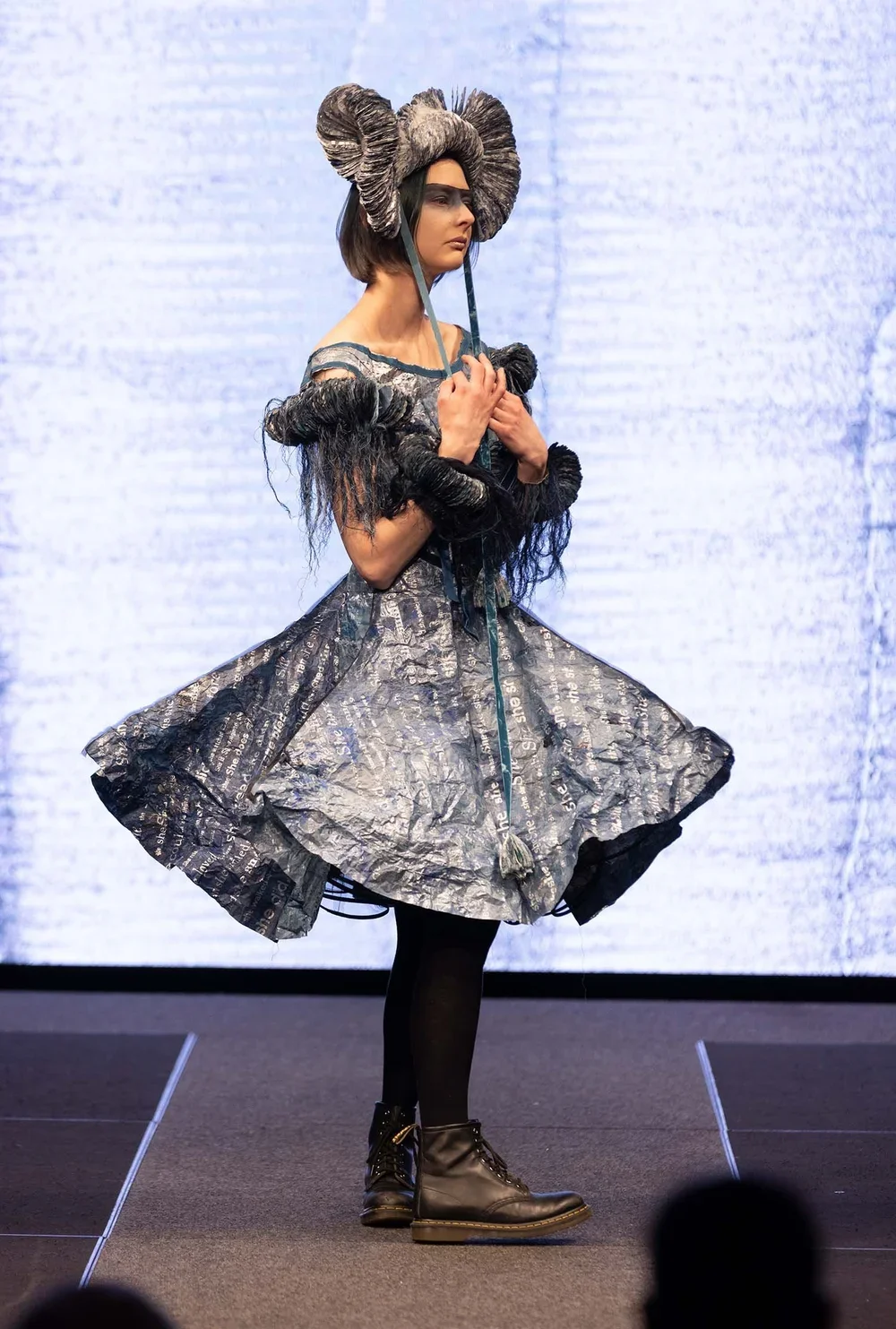 Layers of ink, dye and paint were applied over months of printing and stitching using traditional and contemporary printmaking and bookbinding techniques. The pattern for the dress was created directly sculpting the paper onto the body.