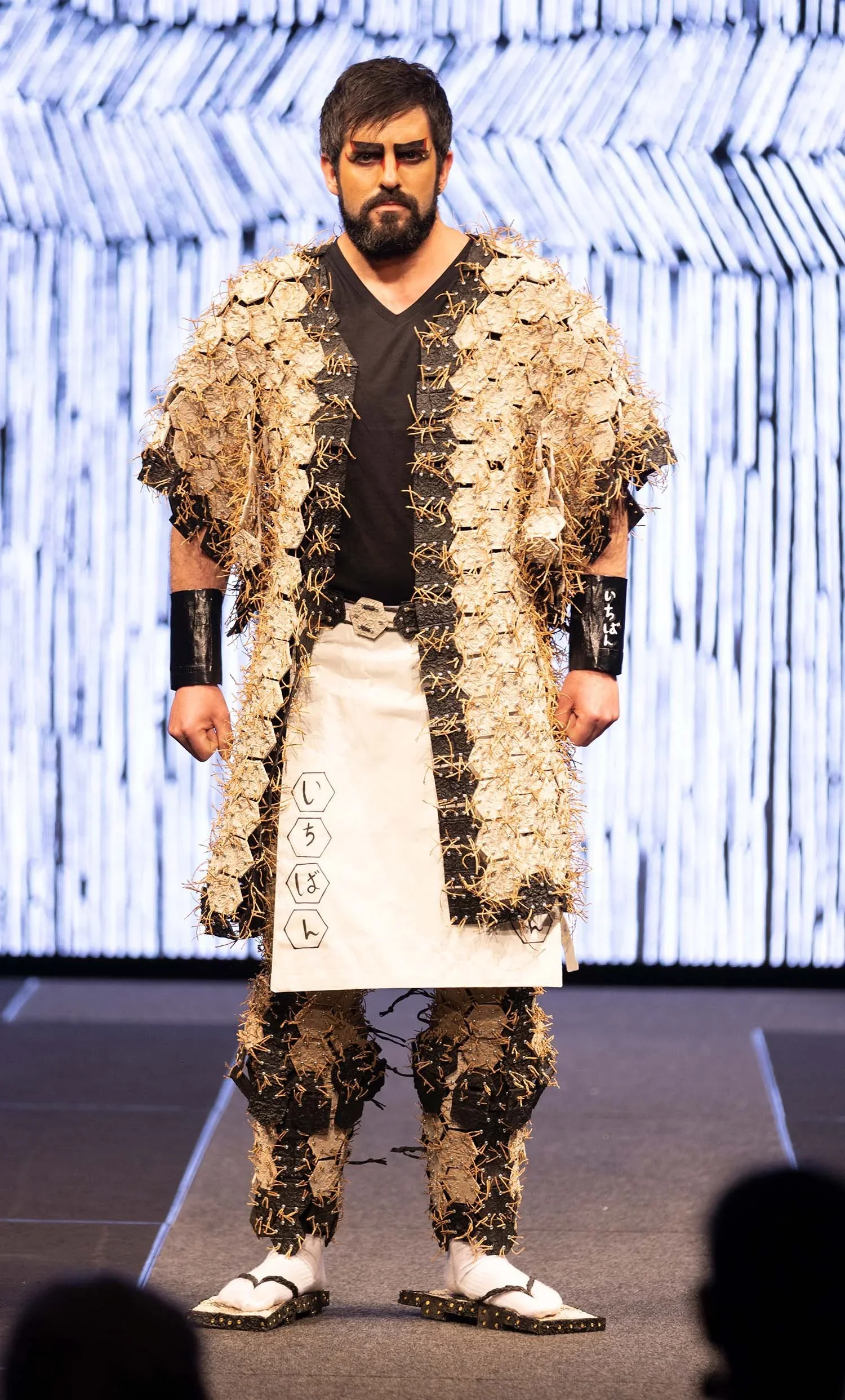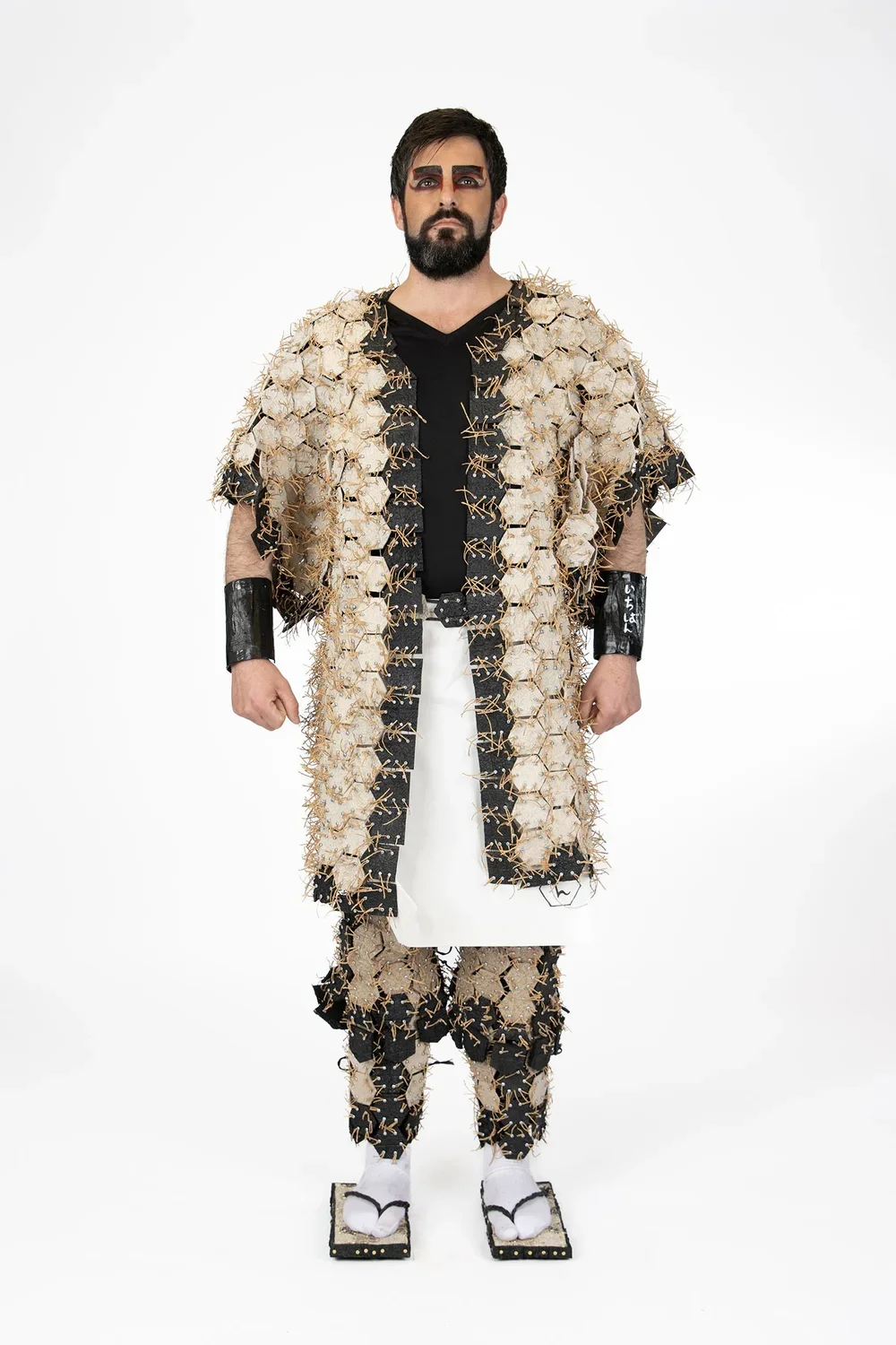 This complex garment, involving months of painstaking work, is best explained by the artist himself: ‘I respectfully create my own stories of modern mythology. This ceremonial kimono represents strength. I use hexagons in reference to strength as the hexagon is the strongest natural structure known to man’.