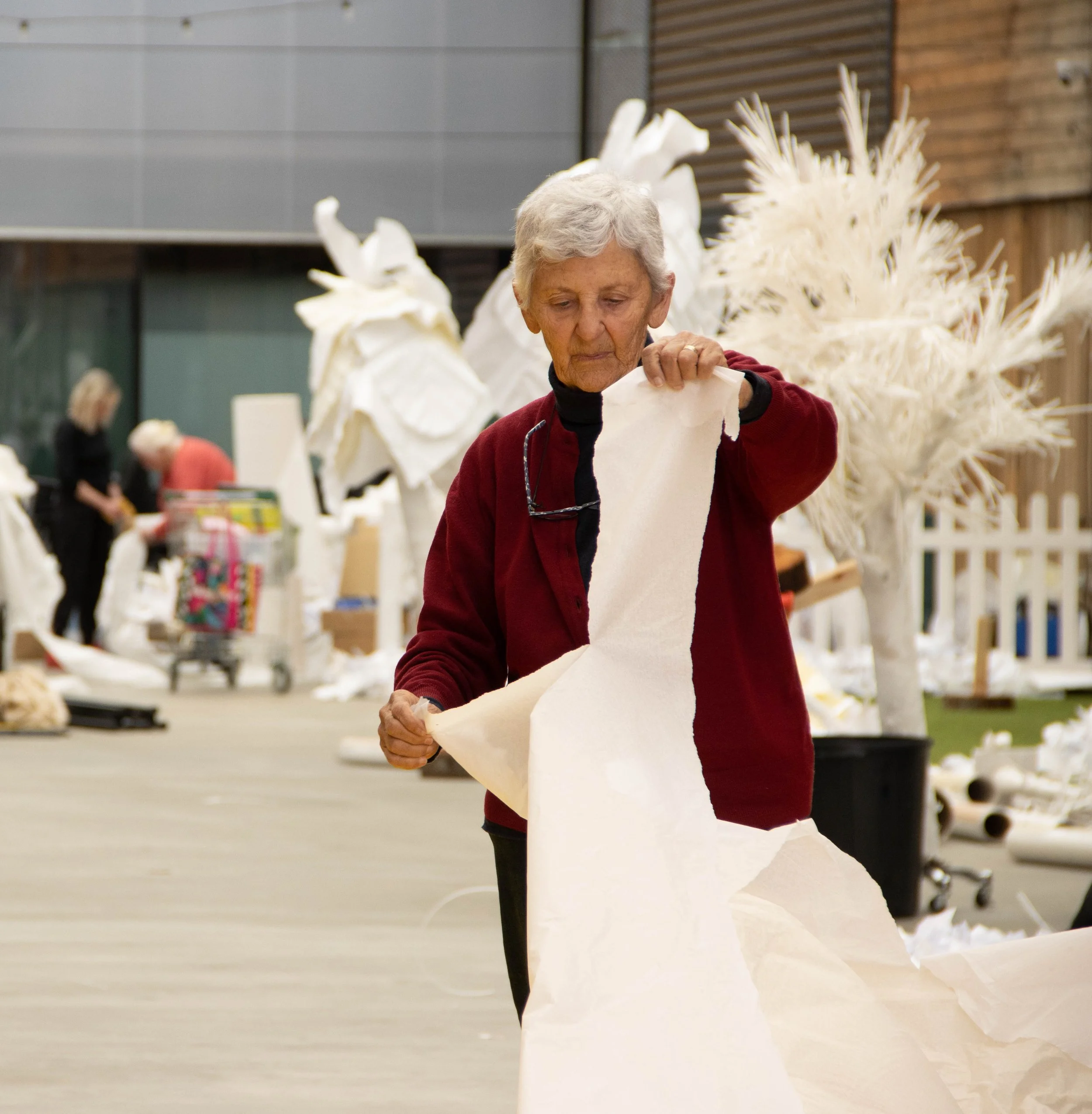 Pam grew up in Burnie during the heyday of the pulp mill. It was the biggest employer in town, bringing economic stability and a thriving sense of community to Burnie. When her youngest child, Lyndal, started school, Pam began taking art classes. After many years as a watercolourist, Pam began experimenting with paper art, creating a suite of life-size papier-mâché sculptures with her creative partner, Ruth Rees.